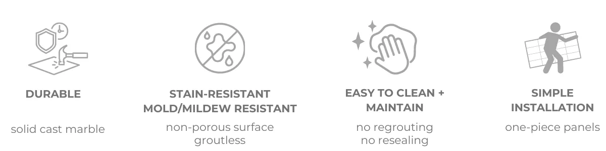 | Porous grout = mold + mildew | Sanitary / Non-porous | Sanitary / Non-porous |